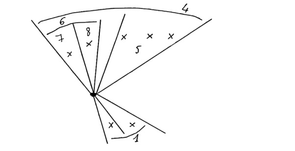 Dann finden wir einen ersten Punkt, berichtigen ihn innerhalb dieser Fläche, bis wir zwanzig Punkte später den Punkt gefunden haben, der auf all diese Bedingungen zutrifft, und auch dann noch zutrifft, wenn später Kritias und Empedokles alleine zurückbleiben.