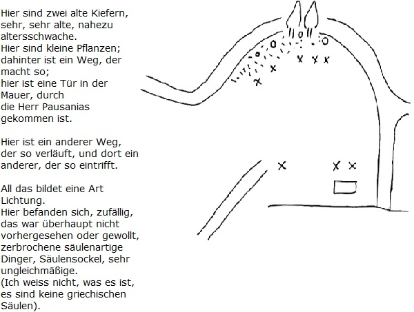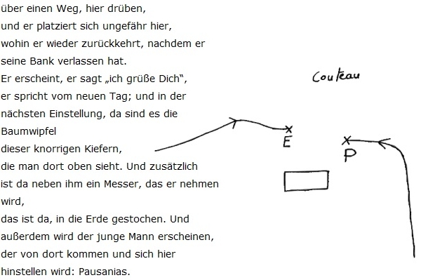 Ab da haben wir dann gefilmt: die leere Bank; Empedokles, der sich setzt und sein Messer neben sich hinlegt; Empedokles alleine sitzend, weil der Junge ein bisschen auf sich warten lässt beim Hinsetzen; dann Empedokles mit dem sitzenden Jungen neben sich (niemals der Junge alleine, nur im Augenblick, wo der Junge sich erhebt). Und dann, wenn er sagt: „Siehe! Was ist das?“, macht die Kamera, die hier war [vgl. Skizze oben], einen Sprung zurück zum vorhergehenden Standpunkt, der der von Empedokles' Auftritt ist. Sie weicht mit Gewalt hierhin zurück, begibt sich auf Position Nummer 1, um dann den Prozess zu filmen.