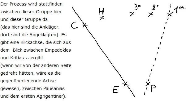 Es musste also eine Stelle gefunden werden, die es einem erlauben würde, diese prozessmäßigen Beziehungen, zwischen Angeklagten und Anklägern, von einem Standpunkt aus zu filmen, der sich in dieser Region befindet, diesseits dieser Blickachse, ohne jemals darüber hinaus zu gehen. Wir haben uns also auf die Suche gemacht. So ergab es sich, dass wir diesen Punkt beinahe auf besagter Achse gefunden haben, etwas näher an den zweien dran als an den fünfen. Von diesem Kamerastandpunkt aus filmen wir Empedokles einzeln, filmen wir Pausanias einzeln, filmen wir die fünf, filmen wir die zwei, filmen wir einen und filmen wir einen. Das macht acht verschiedene Einstellungstypen.