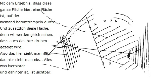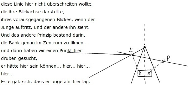Sobald wir das bestimmt hatten, mussten wir dann noch wissen, aus welcher Höhe man diese Leute betrachtet. Das Prinzip war... genau gegenteilig zu Moses und Aron, wo wir uns auf aufeinander gesetzten Türmen befanden; Turm auf Turm kamen wir so manchmal auf Höhen von zehn Metern über dem Erdboden, oder lagen manchmal auf dem Boden, um das Auge an die Suchermuschel der Kamera zu kriegen. Hier, dieser Film, das war einer, wo alles von einer Höhe aus gefilmt wurde, die beibehalten wurde, was von jemand anderem auch schon als Augenhöhe bezeichnet worden ist˟˟˟. Das entsprach ungefähr meinen Augen oder denen des Kameramannes.