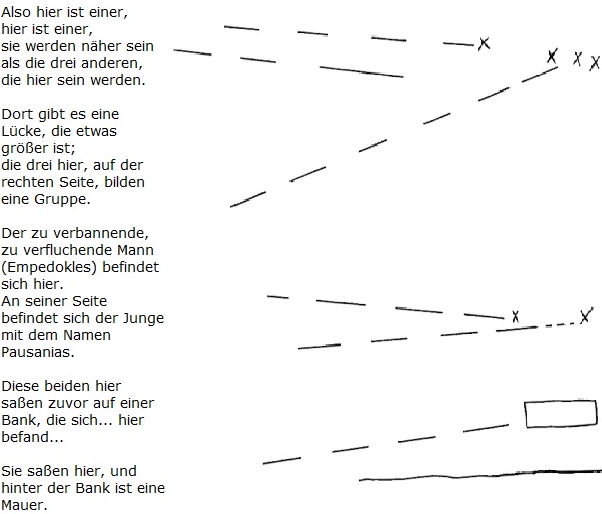 Diese beiden hier saßen (wir werden auf die Szene zurückkommen, in der sie saßen). Dieser hier (Empedokles) steht als erster auf, er sagt: „Nein! Ich sollt es nicht aussprechen, heilige Natur! Verachtet hab' ich dich und mich allein zum Herrn gesetzt, ein übermüthiger Barbar!“˟ Er bleibt dort aufrecht stehen, während er spricht, und durch das Aufstehen wird ihm sein Kopf abgeschnitten. Der junge Mann steht danach auf, macht einen kleinen Rond de jambe, auf diese Weise, und sagt „Ja wohl“ und erwidert ihm „nein, nein, Du allein hast die Gesetze der Natur entdeckt, niemand kennt sie so wie Du, etc. ... und deshalb hast nur Du allein diese kühnen Worte aussprechen und Dich für einen Gott halten können.“ Und plötzlich hört der andere ihm nicht mehr zu und sagt: „Siehe! Was ist das? Hermokrates, der Priester“, (der zweite von links), „Kritias, der Archon“, (der erste von links), und „ein Hauffe Volks.“ „Was suchen sie bei mir?“